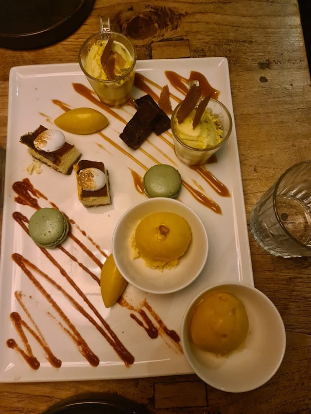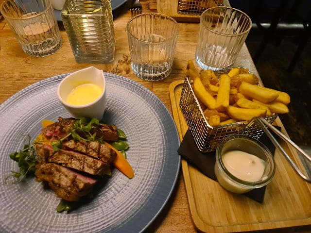 8.5/10We will be back! Excellent french cuisine. Cheap drink prices! Excellent service onsite. We received the wrong order due to a misunderstanding. We ordered a chefs menu cold starter. Which we had but also delivered chef main course. They deducted the price of our other order. We only paid for the chefs main. Good resolution! Will be back. Excellent spot in town. Nice atmosphere. Deer carpaccio with forest mushrooms truffelmayo. (Sweet patato overpowers deer meat. Otherwise excellent!) Duck black garlic. (Excellent!) Chefs Fish trio had a dissapointing tarragon sauce. I love tarragon! beef rouleau (Superb!!!) Chefs menu guineau fowl rouleau (good!) Not ordered. We will be back! Excellent french cuisine. Cheap drink prices! Terrace was closed, no outdoor smoking option. For the 2nd time i tripped and fell of their large curb to rain drain street gap. Be carefull! Just a inch or three too deep.