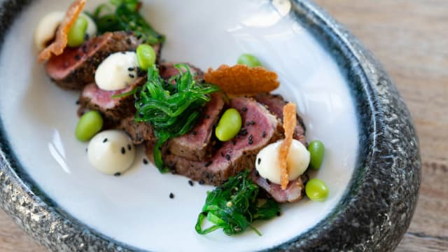 9.5/10Deer carpaccio good! Nicely presented Steak tartare meh. Too course yet too pasted with chunks. Veil and beef roll excellent! Very nice beef in bacon Duck black garlic excellent! Excellent tame duck breast in good sauce with great rosti Plaque with hazelnutcreme and tinkabean ice not as expected, the creme was chocolate and the plaque was sand cookie and not almond. Tonka bean ice is very good!