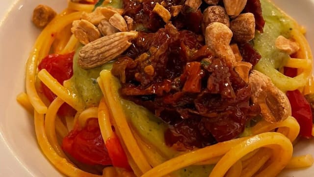 - Mezzi paccheri con zucca, crema di parmigiano, crumble di biscottini al rosmarino e pancetta croccante