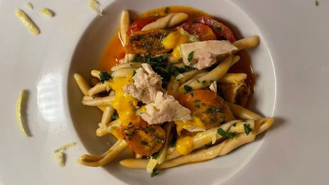 - Scialatielli freschi con salsa di tartufo nero, pancetta croccante, scaglie di caciocavallo silano dop e petali di tartufo nero di calabria (az. pirro)