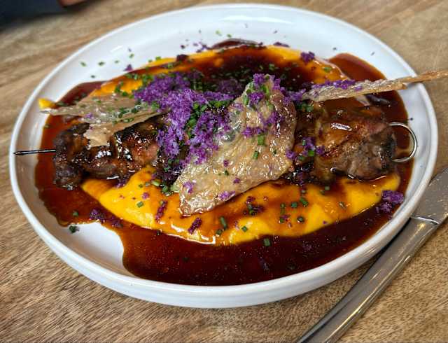 - Navet, noix de pécan, pressé de céleri croustillant au miso et jus de viande cacao