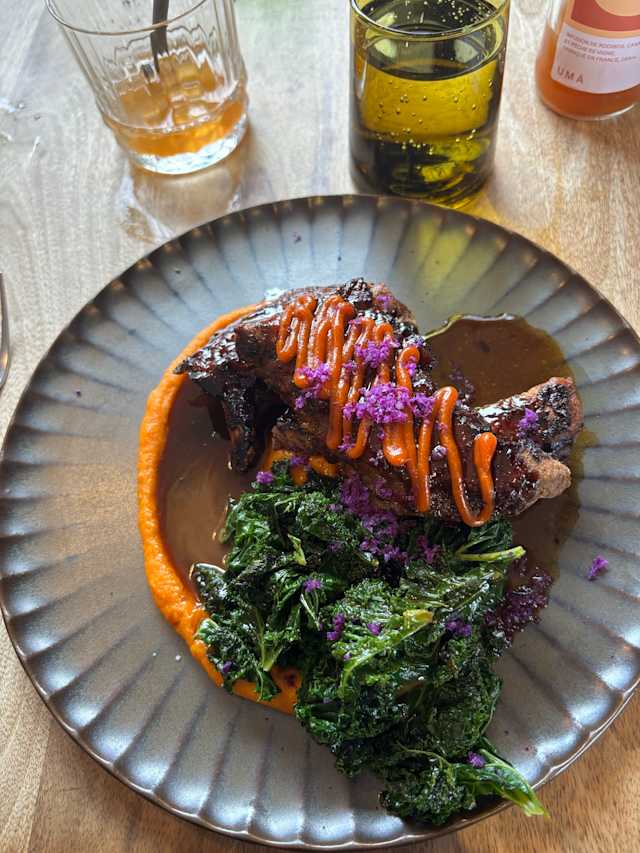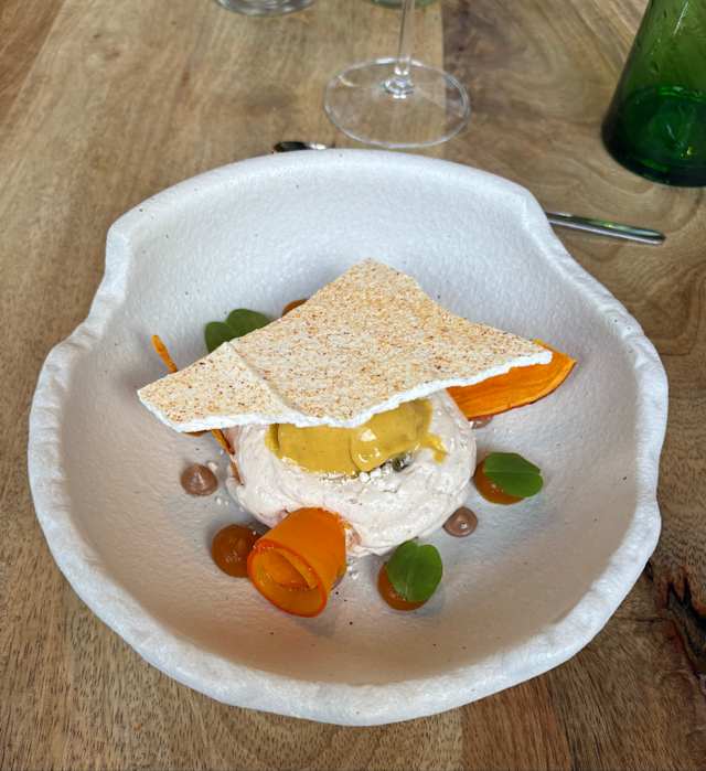 - Crémeux de potiron au lait de coco , chou rôti au tahini et piment , gremolata