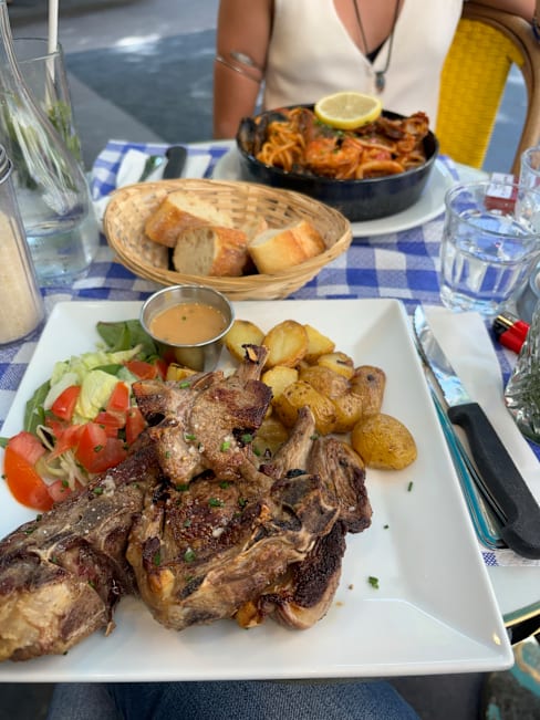 10/10+1This was the perfect spot for the sunset, you could see from between the buildings while sitting outside! nice food I personally chose a steak! but the starter burrata was also nice! Good quality and wine, the waiter was really welcoming! and the Creme Brule was cherry on top at the end!