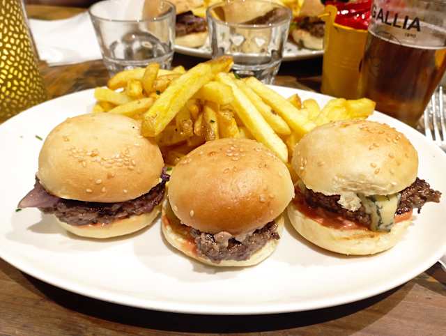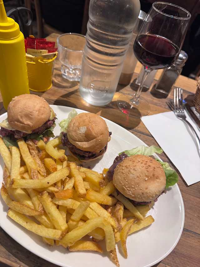 - Trio hamburgers, frites maison (3 petits burger, bleu d'auvergne oignons confits, foie gras)