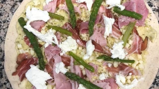 Pecorino,tomate sechées,olives,salsiccia calabraise,et a la sortie du four : jambon cru italien et copeaux de pecorino