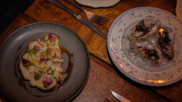- Champignons rôtis, sauce au poivre noir, huile de kampot