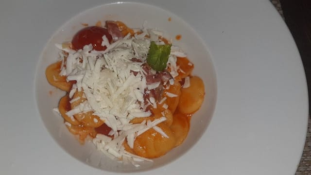 Ravioli ripieni di burrata su vellutata di zucchine, guarniti con pancetta croccante per un contrasto di sapori e consistenze.