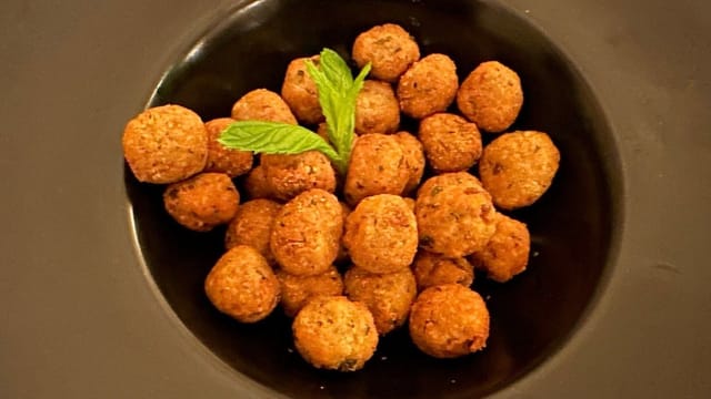 Patatine fritte e polpettine di pane e menta, servite con la nostra maionese vegetale