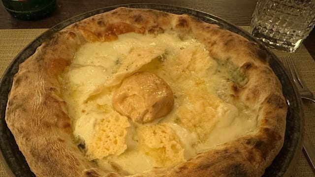 Fiordilatte, pancetta tesa, in uscita spuma di parmigiano, tuorlo d'uovo marinato e pepe.