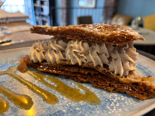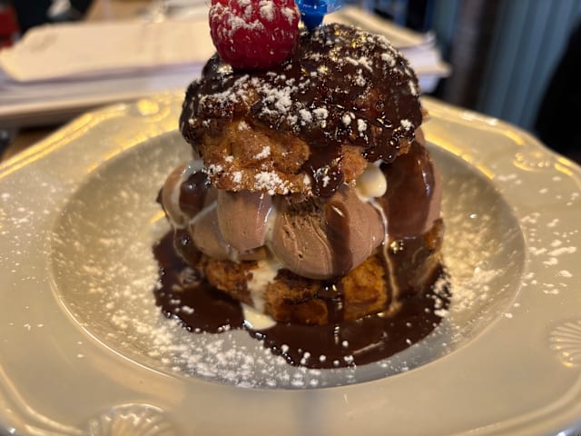- Brioche façon « pain perdu », glace vanille et caramel au beurre salé