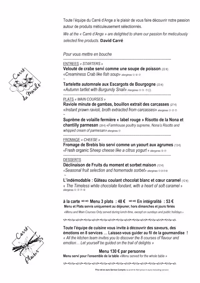 Le Carré d’Ange is an excellent restaurant, the cooking is creative - try the ‘ Chartreuse d’Asperges et glace au son de moutarde’ - but is also absolutely accurate. The St Pierre, foie gras and veal were all beautifully cooked. The service is good, friendly, efficient and knowledgeable. This was a delicious meal in a delightful setting outside on the terrace. This establishment deserves a Michelin star.
