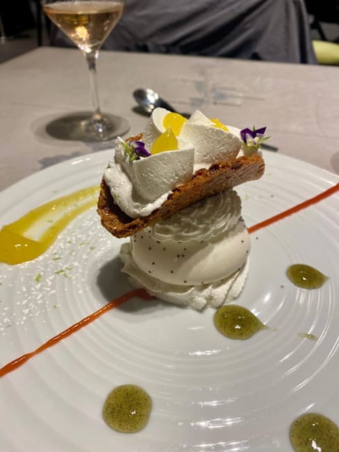 10/10Wonderful veal dinner. Excellent chestnut creme crisp for dessert paired with superb muscot dessert wine. Romantic outdoor table at foot of palais.