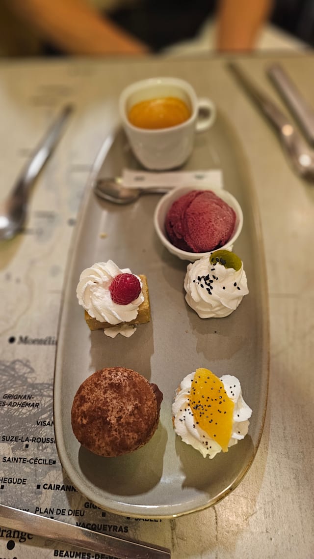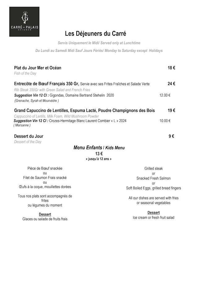 9/10+1Tucked inside the historic Palais des Papes square, Le Carré du Palais delivers not just a meal, but a moment. The location is superb, surrounded by Avignon’s architectural grandeur, with a terrace that lets you linger under the Provençal light. The food was great, reasonably priced. Although the wine bottle of Gigondas I ordered was disappointing, the waiter suggested that we could return. Eventually I did not. Since i did not he offered me 2 glasses of Hermitage. I cannot ask for more. We ordered the Grand Menu- Entrée+Plat+Dessert.