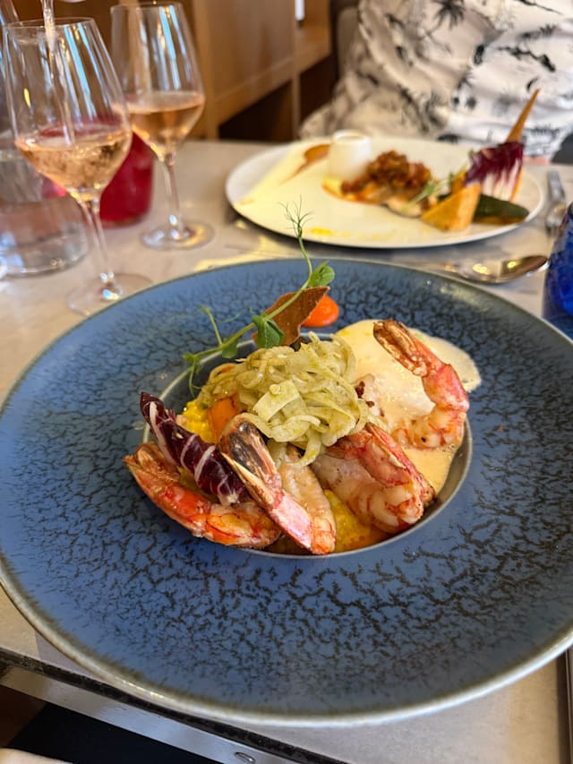 8/10There were two of us and we had two courses each with matched wines. Everything was well presented and fine except for one course which was a risotto. Unfortunately the risotto had either been over cooked or had waited much too long in the kitchen. By the time it reached the table it was a heavy pudding, with the rice grains cooked away to a general stodge. The elements with it, for example prawns, were quite separate rather than part of the whole effect, as might have been expected.