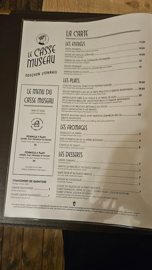 10/10On our final night in France my wife, me, and another couple had dinner at Le Casse Museau. This, after eating several wonderful meals in Burgundy. Eric and crew were wonderfully welcoming, which was followed up by a delicious Bouchon offering. I started with the oeufs followed by the quenelle brochet. When we return to Lyon we will come back again. Don’t hesitate to visit.