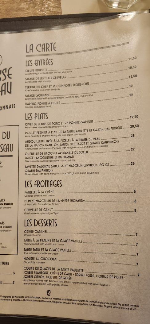 10/10Aunt Paulette's chicken with garlic and gratin dauphinois - the signature dish - it really is outstanding. I dined twice at this restaurant during my stay in Lyon and ordered the chicken dish on both occasions. For travelers a bit unsure about the traditional bouchons dishes that Lyon has to offer, this restaurant's signature chicken dish is a good bet. Staff were lovely, very receptive and hospitable. The chef would peep out often from the kitchen to check diners were happy, obviously there is genuine care here from the team. Much appreciated.