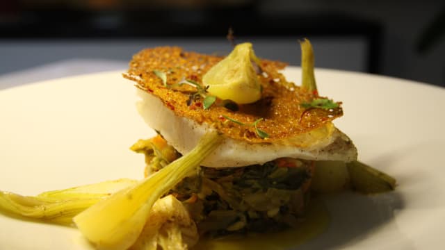 Saumon en croûte d’épices et parmesan légumes du soleil et sauce à la livèche