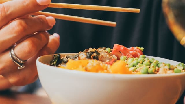 Poulpe snacké, laqué au soja, riz japonais vinaigré, coriandre et gingembre pickles.