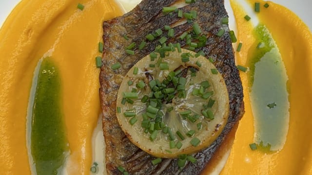 Filet de lieu rôti au four, vierge d'escabèche au vin blanc, citrons confits et échalotes, fine mousseline de carottes au cumin.