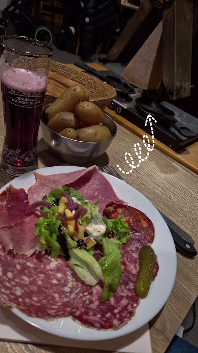 - 1/4 de Reblochon fondu au vin blanc, 1/2 camembert pané fondu et flambé au calvados, assortiment de charcuterie et pommes de terre