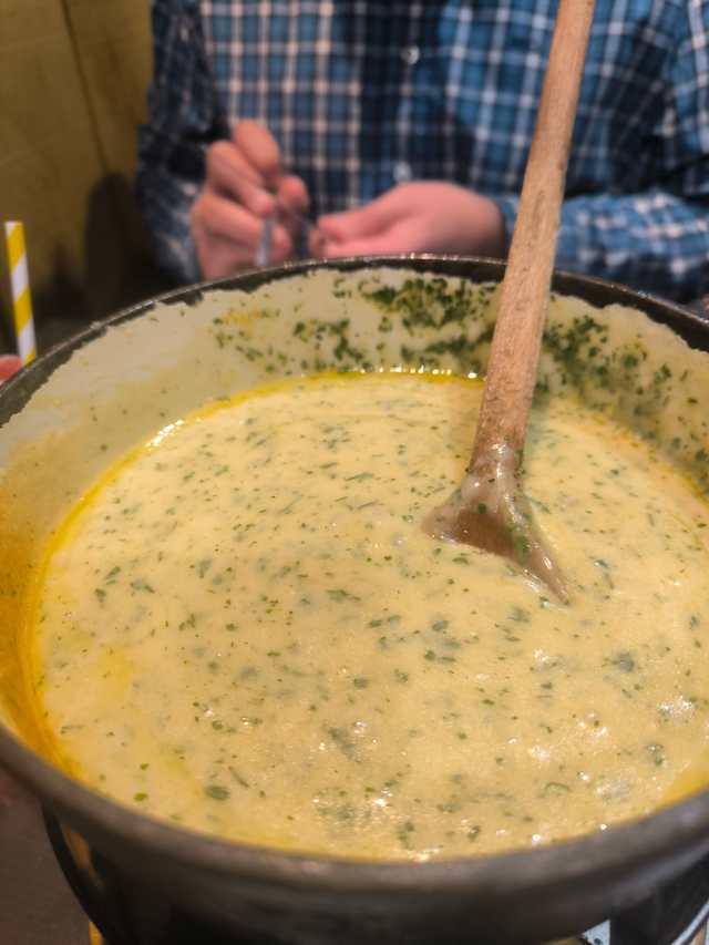 - (Bœuf, poulet, lard, diots de savoie servie avec salade verte, frites, sauce au reblochon)