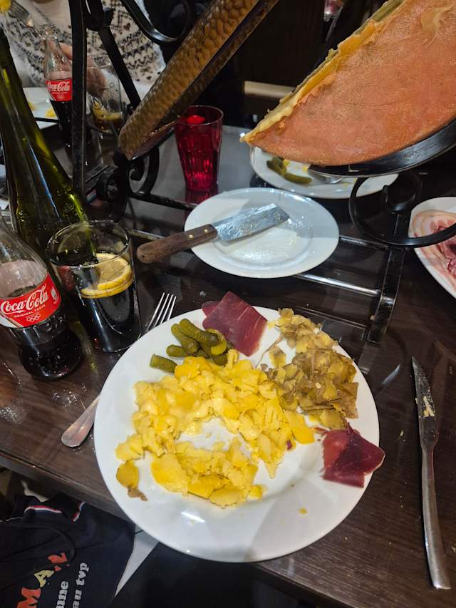 - (Pommes de terre, crème, oignons, reblochon, viande de grison, accompagnée de salade verte)