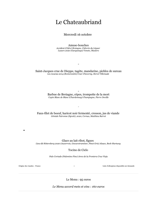 Le Chateaubriand served one of the best meals and experiences. The 5 course meal plus 4 delicious Amuse Bouche tastes were all “A “ quality.