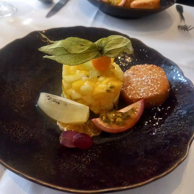 - Carpaccio d’ananas, sorbet citron, tuiles aux amandes