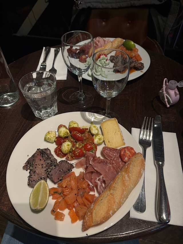 - Assortiment de charcuteries et de fromages : ambon cuit aux herbes, pancetta, speck, salame finocchio, mortadella, camembert, saint nectaire, taleggio, parmigiano, cantal et roquefort