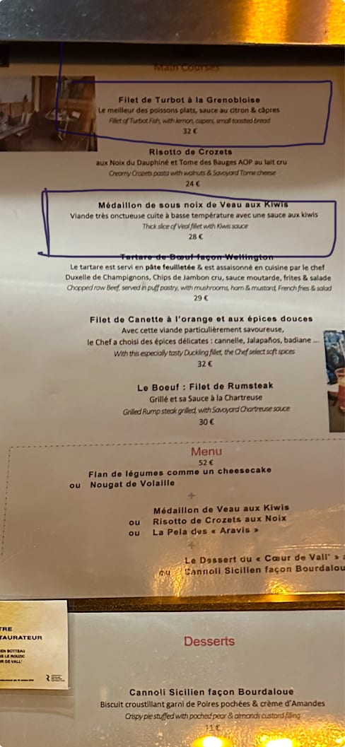 4/10Beware of overcharging! We originally wanted to order ‘Filet de Turbot à la Grenobloise’ (€32), but the waiter said turbot was unavailable and offered Daurade fish instead for €28. My husband ordered ‘Médaillon de Veau,’ which was listed as €28. The food was fine but nothing special. After paying and returning to our hotel, we realized we had been overcharged. The restaurant billed us €32 instead of €28 for the daurade and €29 instead of €28 for the veal. When we called, the owner claimed the prices had changed to €29 for the daurade and €29 for the veal—despite what we were told when ordering. This kind of dishonesty is unacceptable. Check your bill carefully before paying! In summary be careful when dining here. It may seem like a small amount, but it’s dishonest. If they do this to everyone, it adds up—and it’s simply not right. To settle the matter, I went back to the owner and told her directly: ‘Do not cheat your own customers. It’s criminal !!! Beware guys!