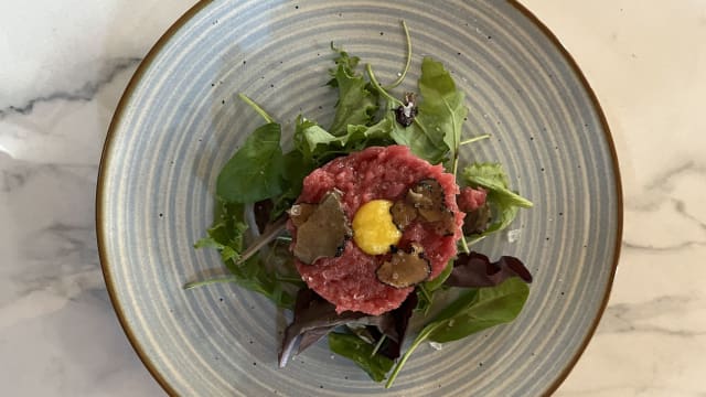 Tartare di manzo “la granda” uovo, scaglie di parmigiano e giardiniera di verdure in agrodolce