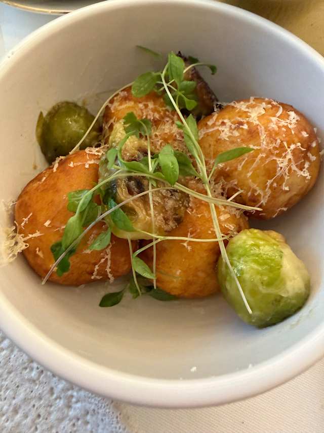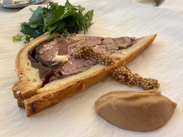 - Pressé de poitrine de veau, sauce blanquette, croquettes de riz croustillantes, carottes fondantes et champignons du moment