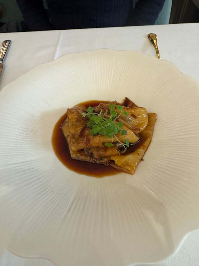- Poêlée de cèpes, oeuf parfait, émulsion de persillade, râpé de jaune d'oeuf confit, brioche en mouillette