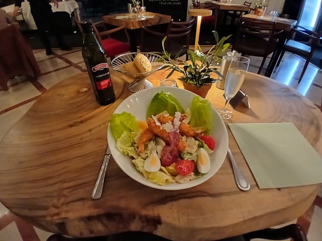 10/10This was Christmas dinner. We wanted a special experience because we were far from home and knew nobody in Menton. The venue looked gorgeous, all lit up with christmas decorations and the room itself was very impressive. It had a high ceiling with what looked like water lillies spread out across the expanse, Unique. The restaurant was almost empty, just one other diner. We liked this, it made us feel special. The waiter was attentive, friendly and nice to have around. The food, three courses, was superb a salmon mousse, pasta and chocolate gateau. The price was very reasonable. I would recommend this place without hesitation.