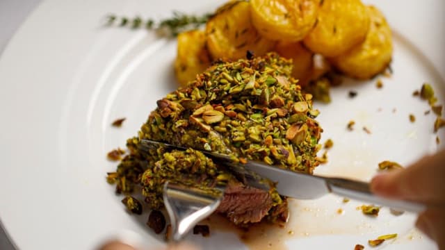 Agnello panato con pane alle erbe, lattuga grigliata e ravanelli