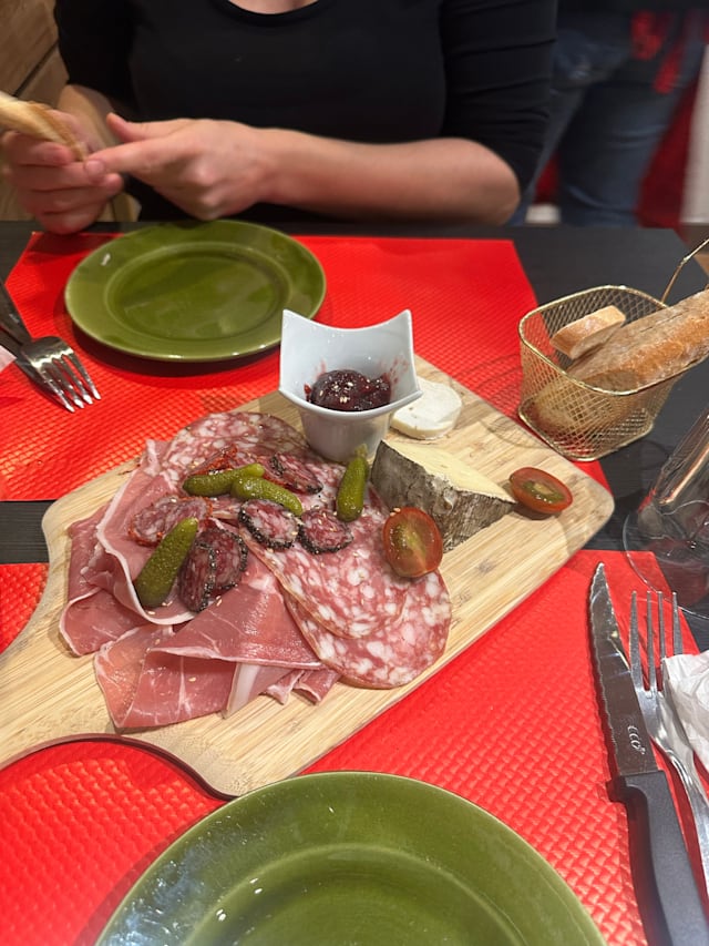 - Jambon serrano, jambon blanc, rosette, chorizo, poivron et tomate confits. Un verre de vin offert par personne