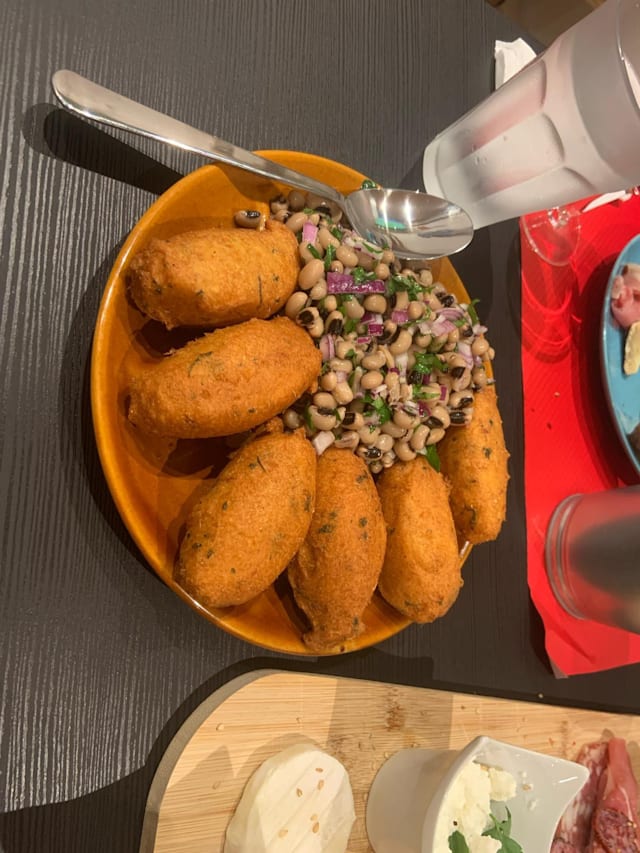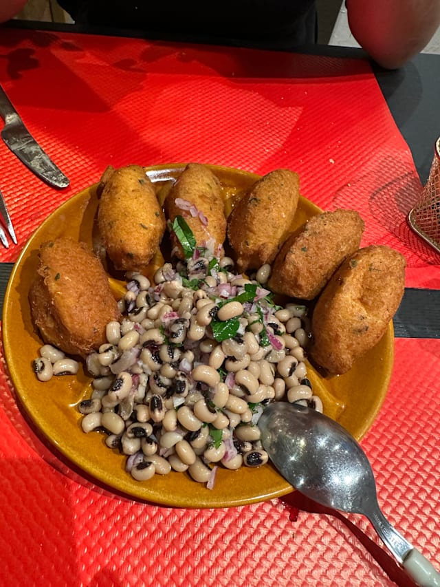 - 6 acras de morue accompagnés des haricots typiques du portugal, oignons, persil, huille d'olive