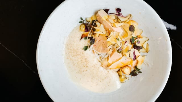 Parfumé au thym, brunoise de céleri de rave, olive taggiasche, tomates séchées, chips de choux vert, crème d'ail noir