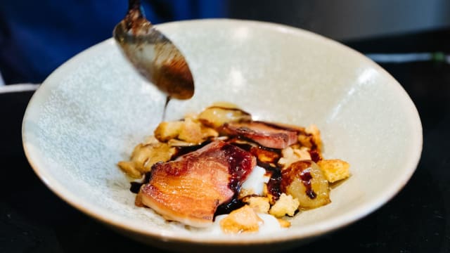 Cuisse de pintade farcie au foie gras, noix en crumble, figues fraiches, rattes à la moutarde, jus de pintade à la confiture de figues