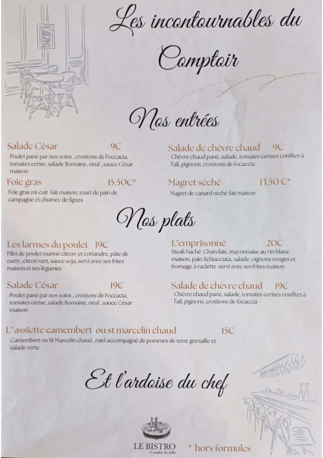 Notre bistrot vous propose des plats savoureux, préparés avec des ingrédients frais, pour un moment de partage entre amis ou en famille.
