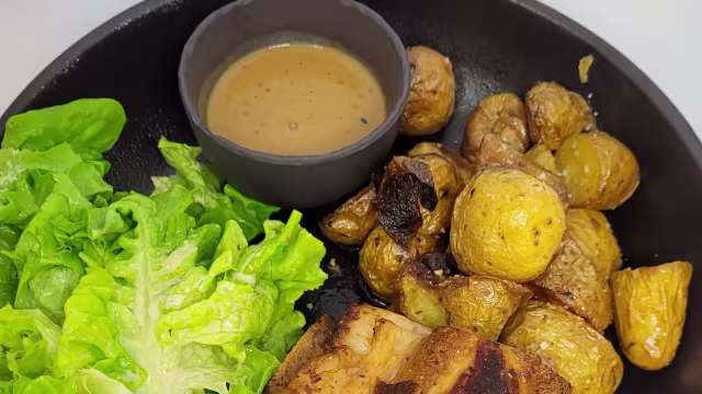 - Confit de canard maison, pommes de terre grenailles et jus à l’ail noir
