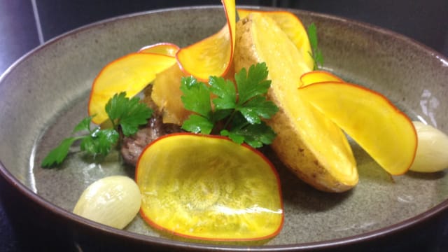 Foie Gras du Sud Ouest Chaud / Quetsche / Siphon de Maî s