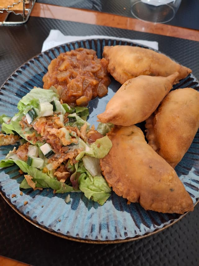 - Brochette de poulet, alloco, pastel bœuf, salade composée et pomme de terre sautées