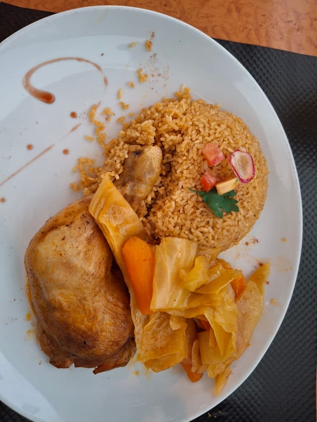 - Riz rouge aux épices douces, cuisse de poulet, brochett de poulet, pastels aux bœuf et alloco