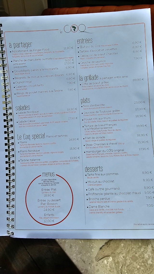 If you plan to eat at Le Coq, the average price should be around €25. The average price is calculated based on appetizer/entrée or entrée/dessert, excluding drinks. Prices have been provided by the restaurant.