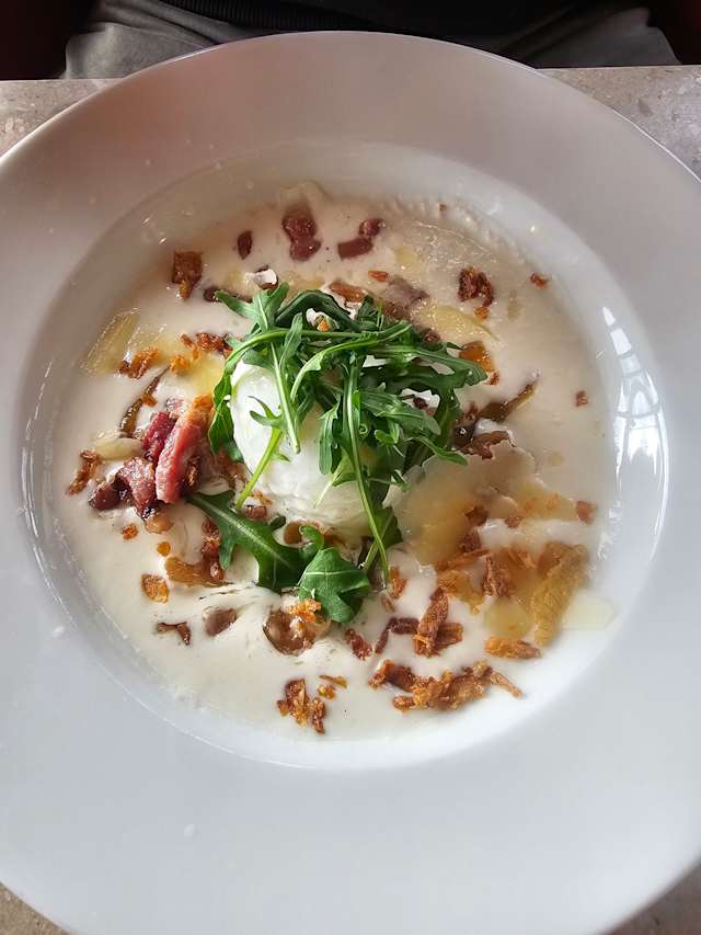 - Crème au comté, lard fumé crispy, oignon confit et copeaux de parmesan