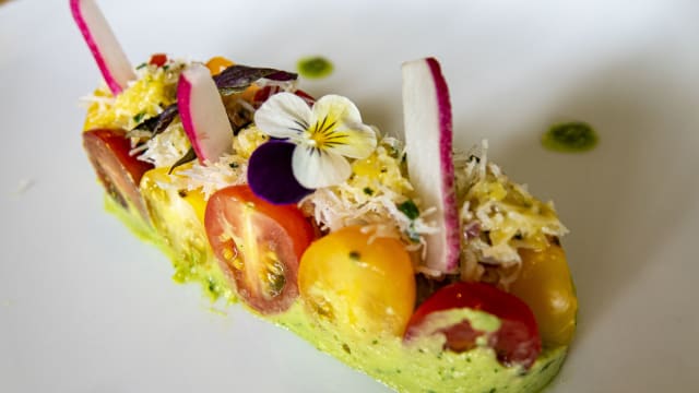 Aubergine grillée, poivron grillé, courgettes, compotée de tomates, copeaux de parmesan, tomates cerises et jambon de pays.
