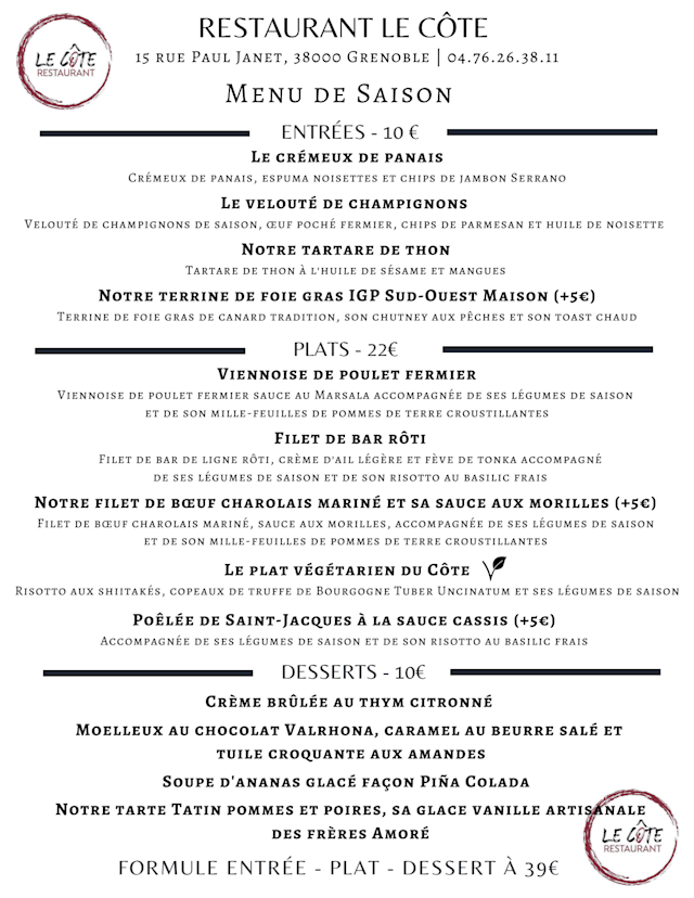 10/10Excellent and creative gastronomic at a non-gastronomic cost. Excellent selection of wines and charming service. A must if you are in Grenoble.