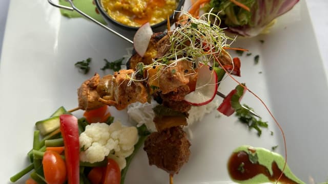 - Morceaux de viande désossés grillés en tandoori, puis mélangés avec de la tomate, du poivre et des épices. Fleischstücke, die im tandoor gegrillt und dann mit tomaten, paprika und gewürzen serviert werden.