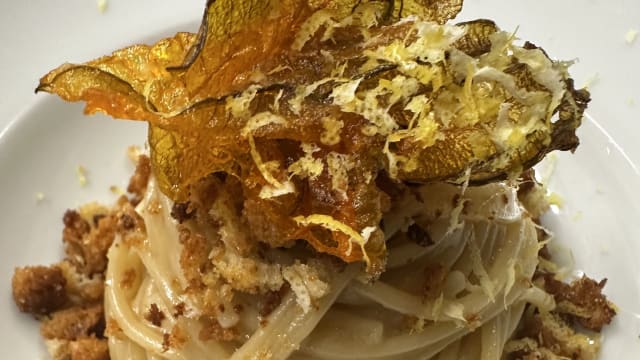 - Pasta corta all’uovo, guanciale, uovo, pecorino, pomodoro del piennolo, crosta di parmigiano, salsiccia croccante